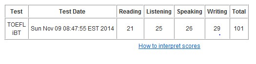 第二次托福考试:101分,写作高达29分。