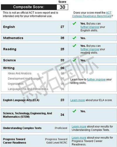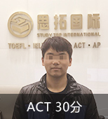 来到思拓之前我的ACT成绩一直在20分左右,由于是高二才临时决定出国,准备时间非常紧张,来到思拓一个月的1对1有针对性补习,对我来说至关重要,这个月我的助教老师督促我背诵ACT词汇,以及安排模考,一个月做ACT真题差不多有10多套题,每次助教老师都帮我计时安排,批改成绩。遇到模考成绩不理想的时候,我也会失落,但是老师们都积极帮我分析问题鼓励我。另外,ACT五个老师在单项上对我的帮助也很大,让我系统地了解了ACT各个单项考试要点,方法技巧,以及有针对性地练习和提高,对我在短短一个月之内冲刺高分非常有帮助,正是有这些可爱而有负责任的老师的帮助下,我才能够取得不错的成绩,从22分直接冲刺到了30分,非常感谢他们。