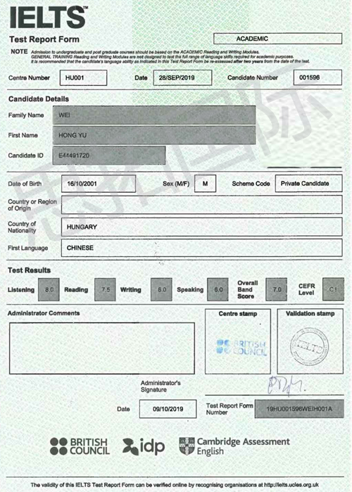 成都思拓教育雅思培训班学员魏H宇雅思成绩